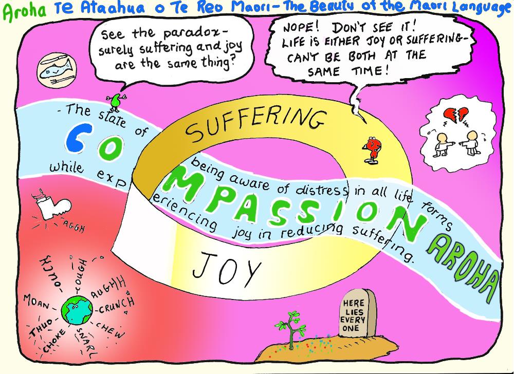 Aroha is perhaps better understood as compassion, the complement of the ego. If “aro” refers to the seat of our emotions and “ha” to the breath, then aroha indeed reminds us in wondrous potential beyond words. The breath is perhaps our most vital and intimate experience of the universal life force. Our every breath connects us to all and refreshes us in the physics of giving and receiving. Aroha is the enjoyment of all the qualities of compassion with all our senses. It has the power to balance the forces of the ego. In so doing it enables us to transcend the paradox of the human condition and be sustained in the universal potential in beautiful ways. He ataahua. He hohonu.
