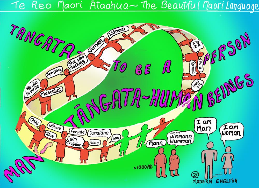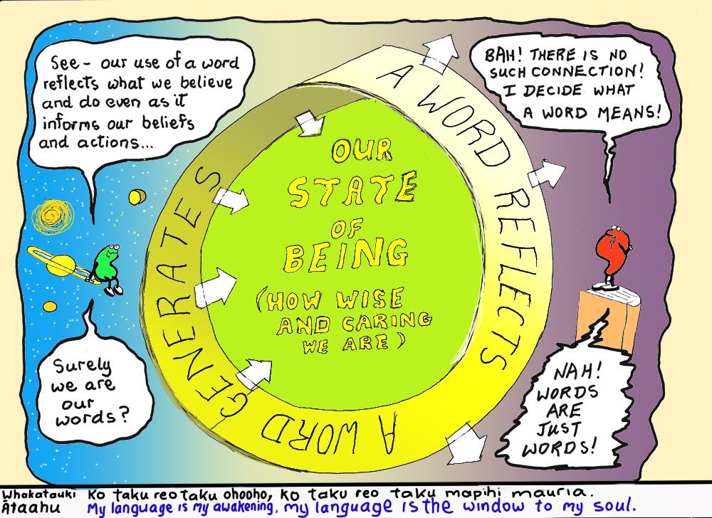 The following section contains the content of the Te Reo Maori page I created in 2019 on the truehope.info website. It is a formation of hasty jottings and adapted cartoons attempting to share that visionary glimpse of how we can all better enjoy transcendent(sustaining, holistic, compassionate) languages, especially in an age when our Crown dialect of English is designed to suppress other cultures and languages and could even destroy Mankind*.