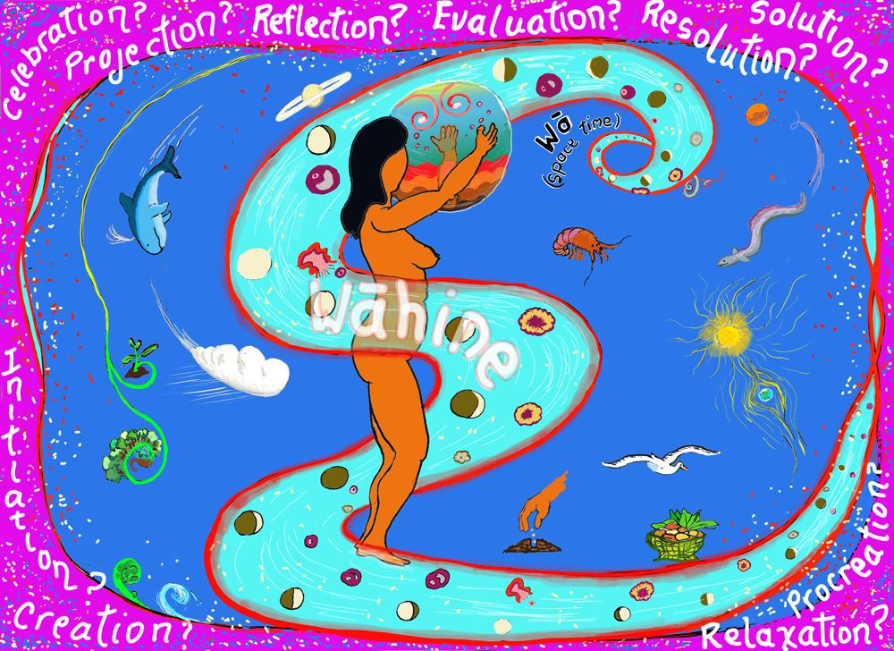 This potent, beautiful awareness of family, land, water, air and the stars, this sophisticated sense of wa is reflected in a profound respect for the role of women in our lives, as can be seen in the Maori description of them as “wahine” while younger women and girls are described as “hine”. The menstrual cycle with its periodic flows of red blood forms a potent reminder we are elements of the universal flux of carbon, iron and oxygen from supernovae – the cycles of wahine reflect and connect us to the cycles of our sun, our moon and our planet Earth to its core. We abuse their inherent wisdom at our peril.