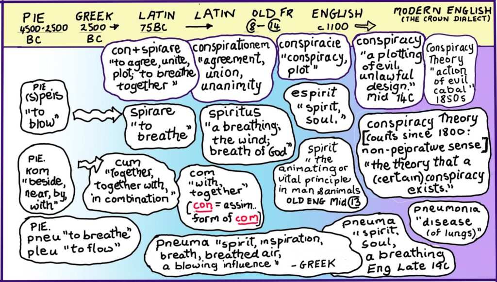 Cartoon illustrating the etymology of the word “conspiracy” and interrelated words since PIE (Proto-Indo-European) times.