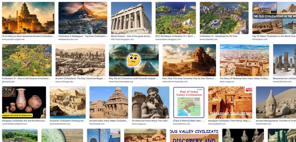 The two screenshots below comparing the top results of searches on the words and “civilization” are perhaps even more instructive. Both associate the words with monolithic structures, “civiliSation” perhaps more so than “civiliZation”. However neither word generates images of contemporary societies.