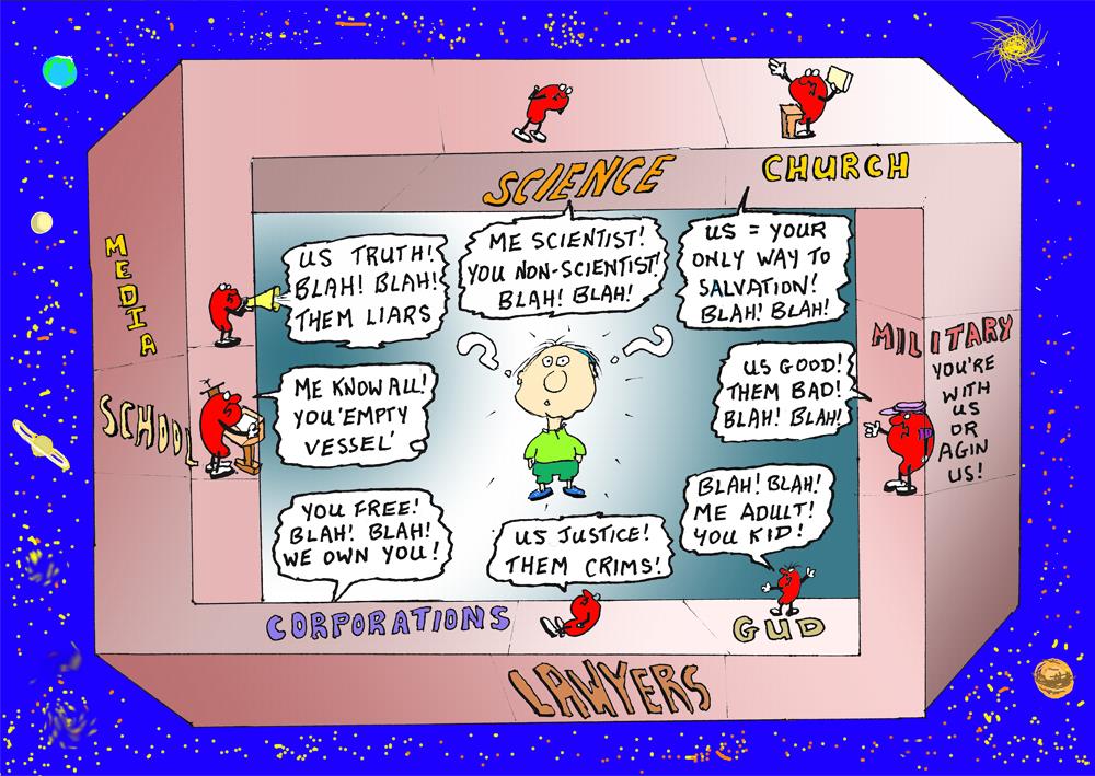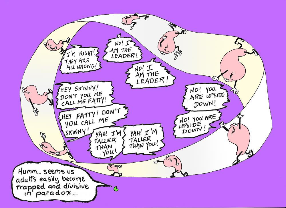 Here are a selection of Dear GUD cartoons playing with paradox. They come with brief comments, some relating personal experiences as an attempt to reassure the reader that one does not have to be very clever or academically trained, less still a towering intellect to understand and transcend paradox.