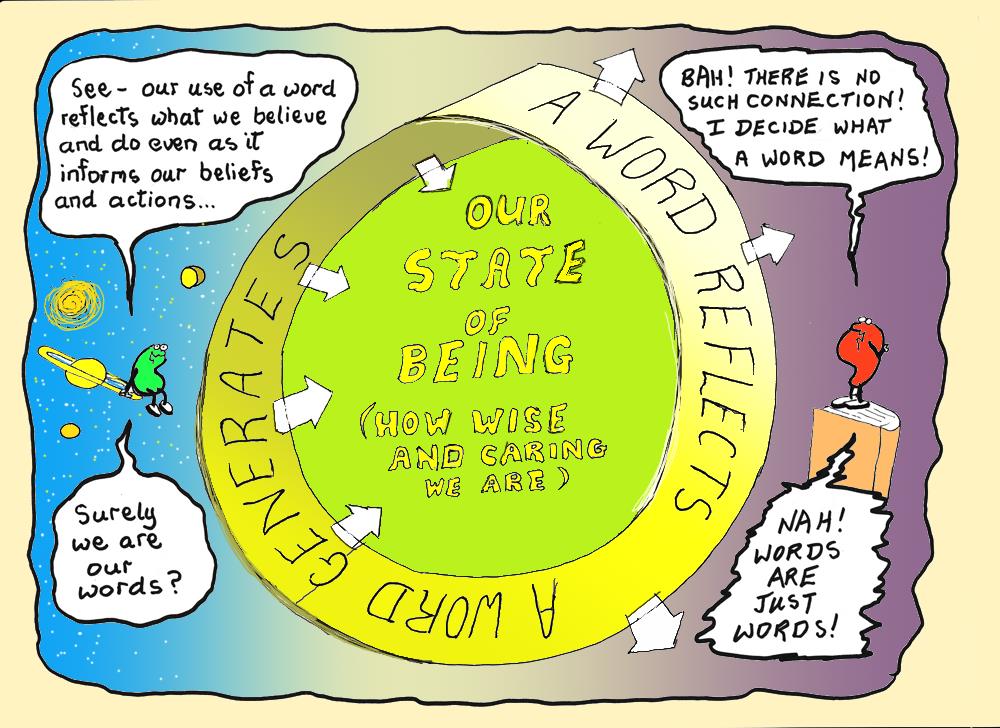 This cartoon is the fourth of five cartoons forming a banner explaining to 12 years-olds how, relative to compassionate language, our use of ego-derived language inevitably leads us to self-destruction.