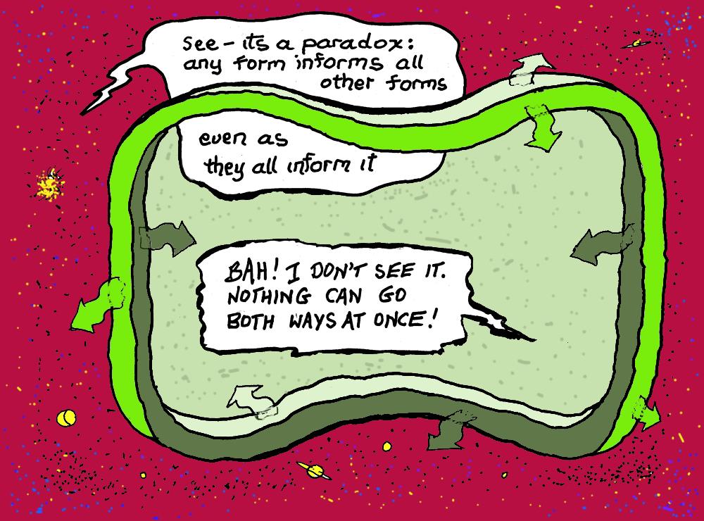 The ego exploits the limitations of spoken language and thrives when it can have us entrap our selves in endless, exclusive circular debate about paradox. Ultimately this is an exhausting exercise in futility.