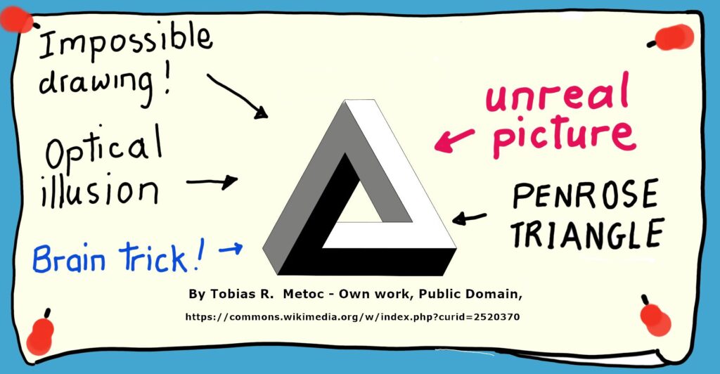 It is not an uncommon sight to see paradoxical illustrations, such as the Penrose Triangle, pinned to the walls in Anglo school classrooms. Often the teacher has written a comment such as “This cannot exist” or “Our eyes deceive us!” or “Optical illusion.”